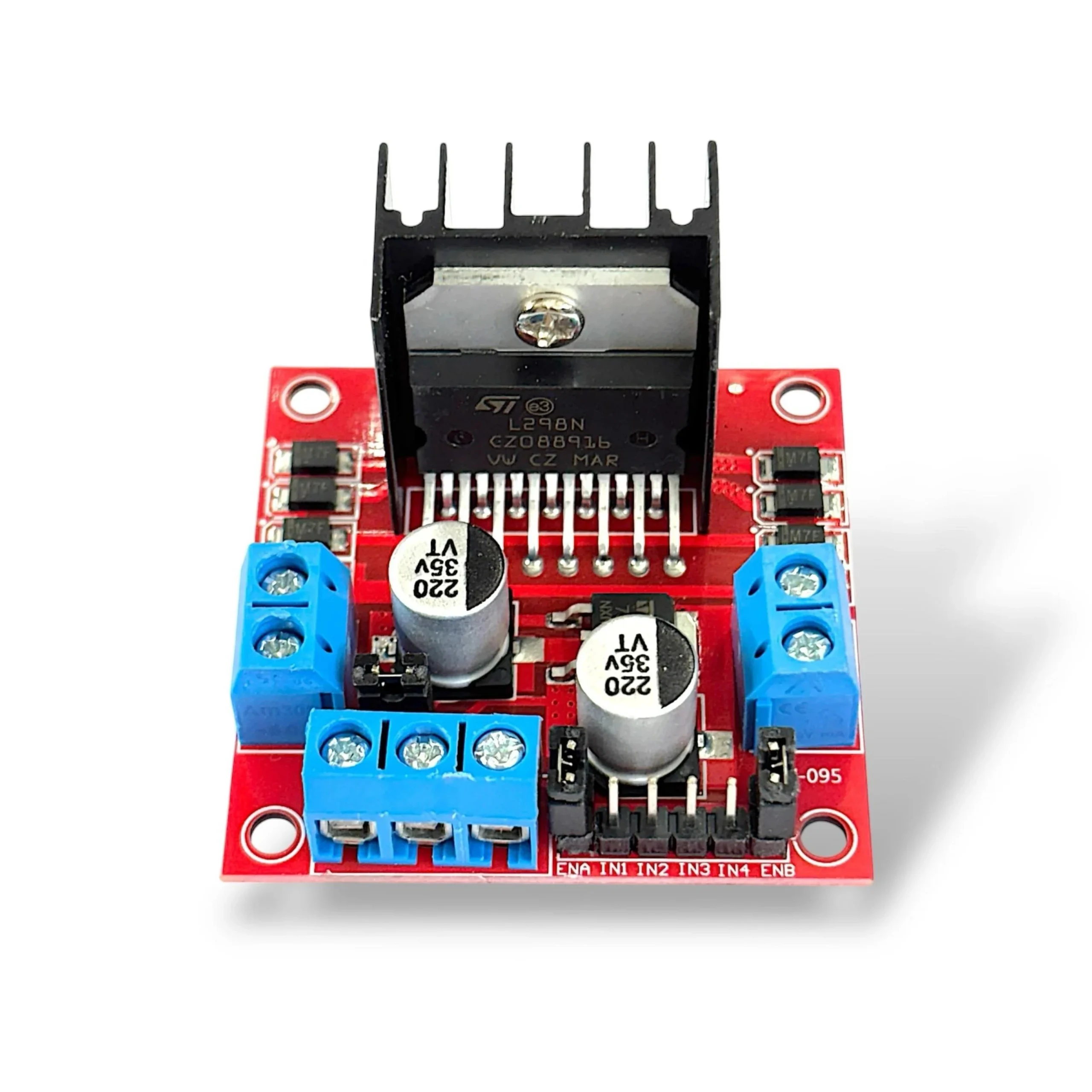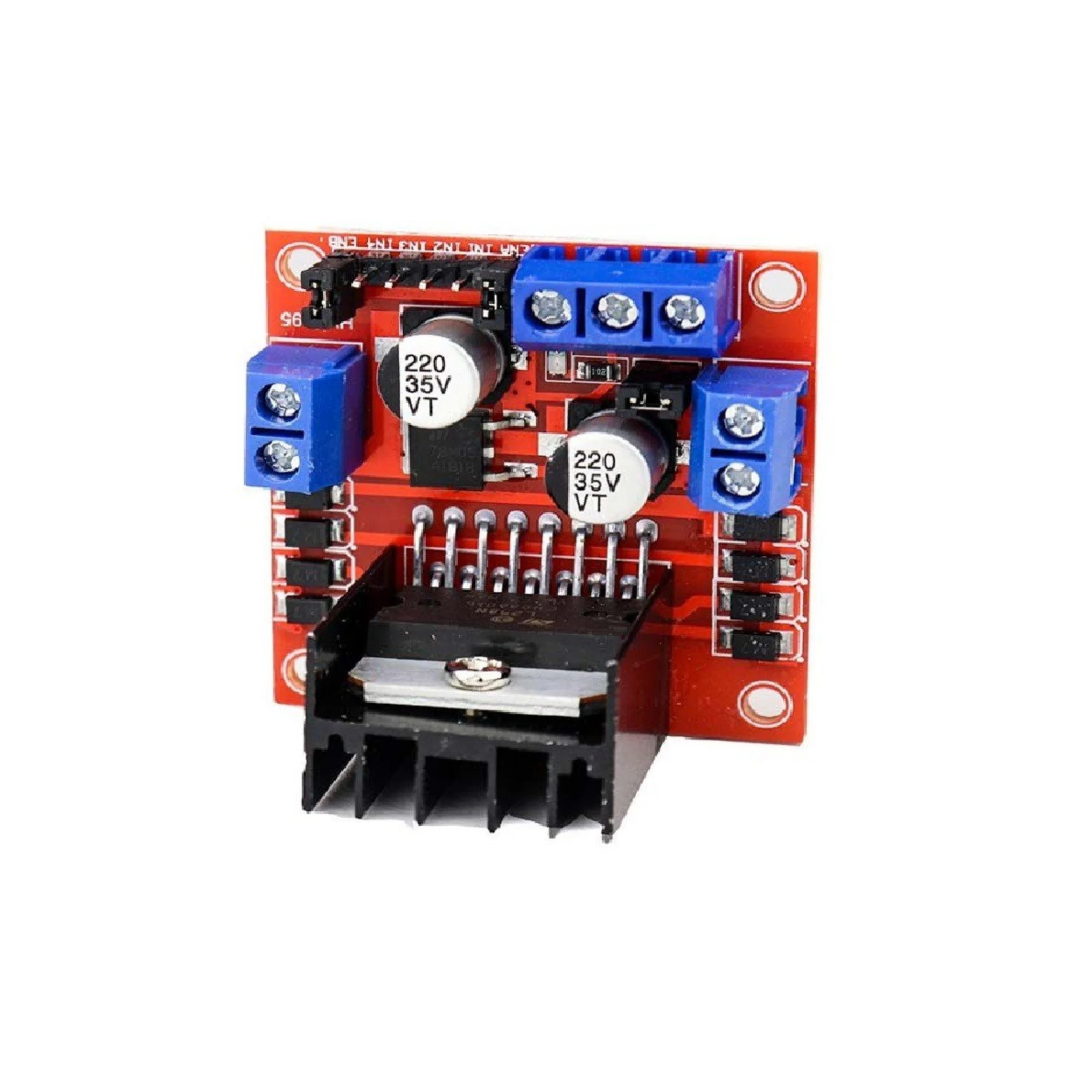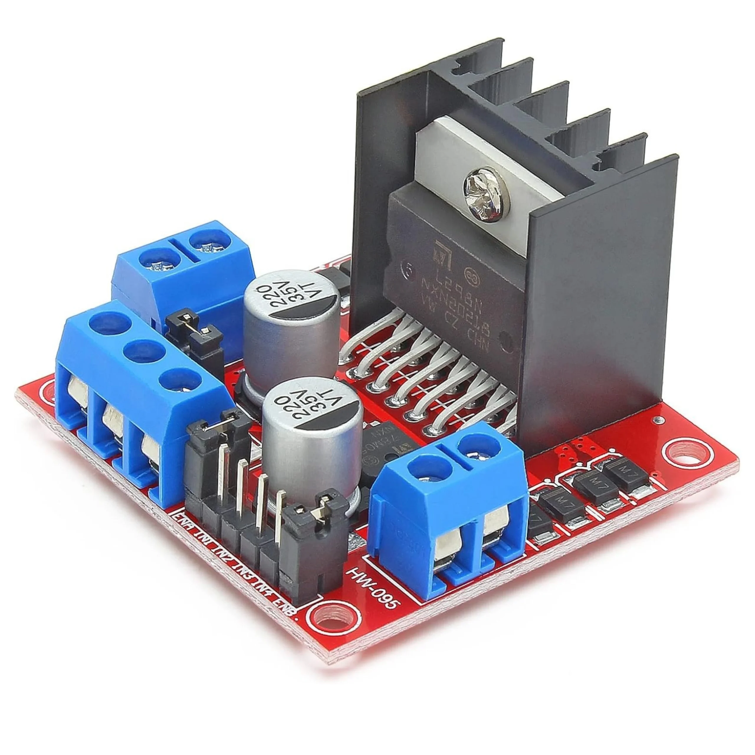 High-power L298N motor driver board for controlling DC motors and stepper motors using Arduino, ESP, and Raspberry Pi.